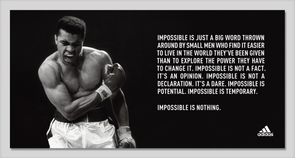 “Impossible is just a big word thrown around by small men who find it easier to live in the world they’ve been given than to explore the power they have to change it. Impossible is not a fact, it’s an opinion. Impossible is not a declaration, it’s a dare. Impossible is potential. Impossible is temporary. Impossible is nothing.” – Muhammad Ali